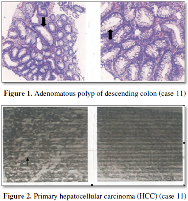Case 11: A 63 year old man was diagnosed as his hepatic tumor due to his occasional colon polyp examination (Figure 1). At CT examination on August 23, 2012 and September 1, 2012 respectively showed 2.0 × 2.4 cm tumor in the right anterior lobe of his liver. Moreover, on B ultrasound on September 3, 2012 and December 13, 2012 respectively also consistently showed 26 × 17 mm mass in the right anterior lobe of his liver. Histologically, primary hepatocellular carcinoma (PHC) was further diagnosed after biopsy of liver tumor tissue on April 26, 2013 (Figure 2). The remainder of liver enzyme performed serum AFP 1.74 ng/ml (control 0-7.0 ng/ml). He had a past history of viral hepatitis B (HBV) infection. The patient was once undergoing radio-frequency ablation of HCC on September 4, 2012; and repeat CT examination the tumor size was increased to 33 × 31 mm on April 15, 2013 and 33 × 37 mm liver nodule on June 17, 2013, respectively. In May, 2014 he was therefore given his hepatectomy (at right lobe), with the combination treatment of Sorafenib tablets (initial dosage 2#/day × 5 months, then 1#/day intermittent until to 1.5 years) and antivirus Entecavir despensible tablets. In the follow up, he was remained well with over 5 year’s survivor.
