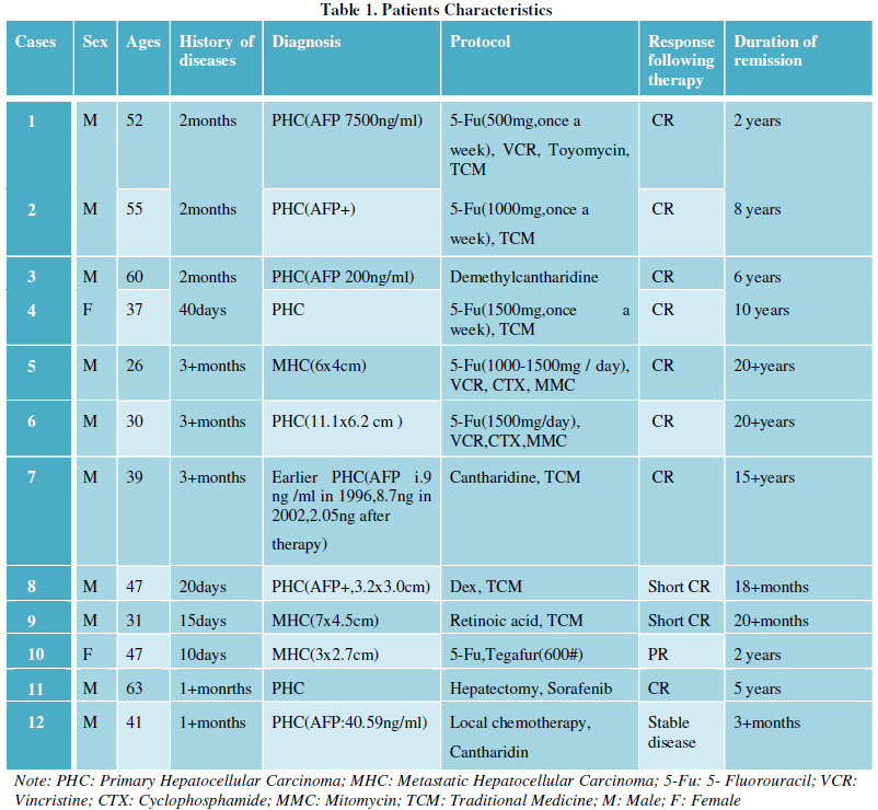 In this study, the objective response was obtained in 12 cases of hepatocellular carcinoma (HCC) following chemotherapy and traditional medicine. Among them, the clinical data for ten patients with HCC were previously described, and 2 cases were continuous to be present here. During the schedule of drug administration, 12 cases of HCCs were treated using the different protocol of chemotherapy in conjunction with traditional medicine. One HCC accompanied with colon polyps obtained complete remission via hepatectomy and targeting oncogenic receptor tyrosine kinase inhibitor sorafenib. And, an approach to hepatic artery intervention chemotherapy plus cantharidin was carried out in another advanced HCC. All 12 patients with disease-free survival were 2, 2, 8, 6, 1.6, 1.8, 10, 15, 20, 20, 5 years, respectively. In discussion, the incidence of HCC is on the rise due to the impact of HBV and HCV, an additional recent data implicate hepatocyte growth factor (HGF)and HGF receptor oncogenic signaling (also HGFR/met oncogenic receptor),which act as a trigger for liver regeneration even in (hepatocellular) carcinogenesis.
