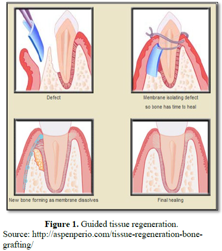 One of the crucial cellular events is recruitment of cells as the cell-type selection determines whether healing occurs by repair or regeneration. When the flap is replaced against the tooth after surgical procedure, the most aggressive tissue during the initial phases of wound healing is gingival epithelium which leads to repair with formation of long junctional epithelium which is a weaker union [4]. The critical issue is the regulation of timing of differentiation and maturation of all progenitor cells to restrain the epithelial cells from forming long junctional epithelium and simultaneously promoting selective population by regenerative cells to achieve true regeneration. In this context, clinical procedures and devices were envisioned to retard epithelial tissues from early access to the root surface. Since the pioneering guided tissue regeneration (GTR) experiments of just over 30 years ago, studies have repeatedly demonstrated that periodontal regeneration is biologically possible and clinically feasible [5]. However, GTR technique is sensitive and technically demanding. In addition, these modalities present with increased chair side time for the clinician and pose a financial burden for the patients (Figure 1).