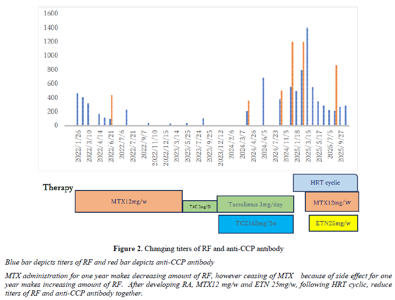 Since January 2022, the patient had been receiving MTX 12 mg/w, resulting in a marked decrease in RF from 463 units to 33 units over approximately one year. However, due to MTX-related adverse effects, the patient was transitioned to alternative immunosuppressants and biologic therapies, during which RF and anti-CCP antibody levels increased. At her first visit to our clinic on December 21, 2024, laboratory evaluation revealed RF 556 units and anti-CCP antibodies 1200 units, with serum E2 below 20 pg/mL and FSH at 80 mIU/mL. Cyclical HRT was initiated for the prevention of RA.