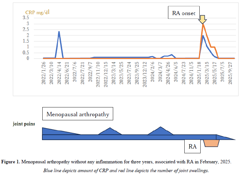 Following initiation of HRT, joint symptoms improved within two months, indicating that the condition had not yet progressed to RA. Consequently, MTX and biologic agents were ineffective at this stage. The first two treating physicians diagnosed RA and primarily administered MTX. Although RF and anti-CCP antibody levels decreased, the patient’s joint symptoms persisted. The second physician discontinued MTX in July 2023 due to adverse effects and pursued alternative therapies; RF levels continued to rise, yet CRP remained below 0.03 mg/dL, and no active inflammation was observed.