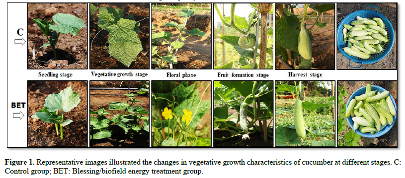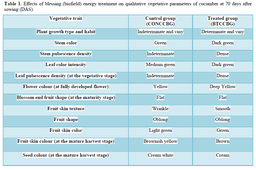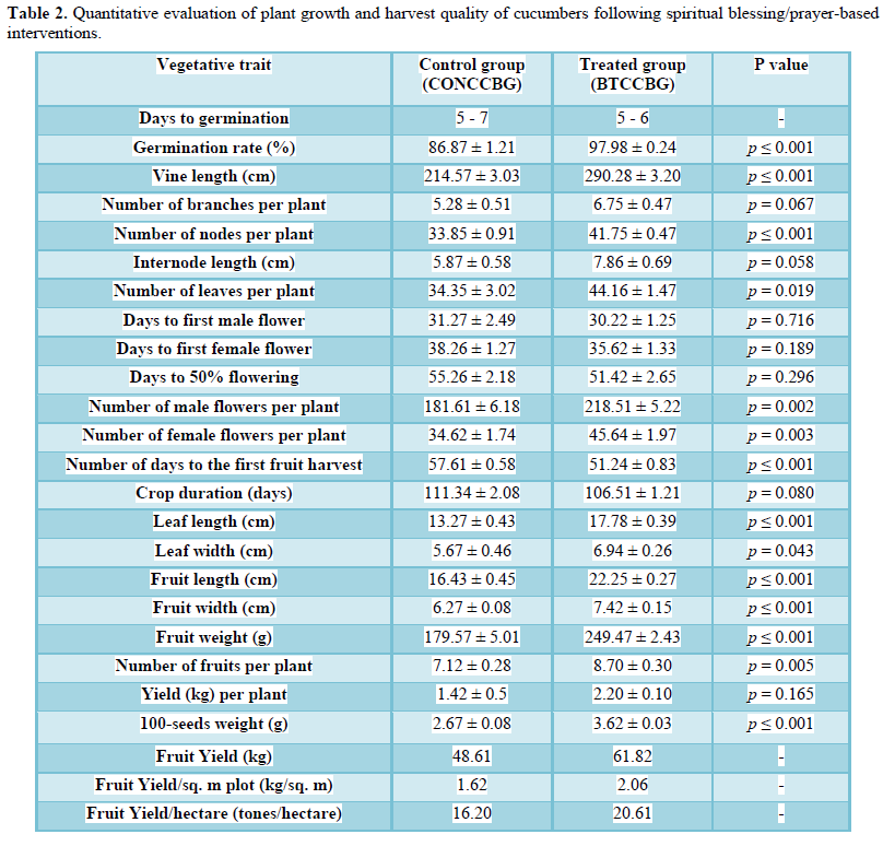 Conclusion: The findings indicated a statistically significant correlation observed between the application of distant spiritual energy and accelerated phenological development and yield in cucumbers.