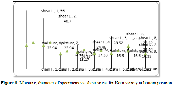 The position (segment) of the tef stem has effect on the shear stress within the same moisture content for each variety. Comparison of each variety with the maximum, average and minimum values of shear stress through the measured moisture content and diameter was plotted by R-software and shows at Figure 7. The relation between the moisture content and diameters on the result of shear stress for each variety at different position is indicated as on the Figure 8 (It is particularly for the variety of Kora (Dz-Cr-438) and the same condition was applied for all varieties of tef).