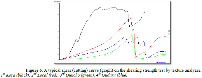 The modulus of elasticity for each variety was computed on the Figure 10. The rheological properties of tef indicate on the tensile test. The typical tensile graph is depicted on the Figure 4. The varieties has maximum and minimum values of elasticity 0.13 and 2.6 Gpa at moisture level 8.82% and 16.6%; 1.02 and 3.6 Gpa at moisture level 10.32% and 13.79%; 0.85 and 3.22 Gpa at moisture level 7.65% and 12.72%; 1.27 and 3.88 Gpa at moisture level 5.5% and 19.70% at upper and bottom position for Local; Kora; Quncho and Guduru varieties, respectively. The modulus of elasticity at harvesting moisture was determined that for wheat 2-6.7 Gpa, barley 11.06 Gpa, rye 11.50 Gpa and rice 0.39-1.2 Gpa [11]. Shahbazi and Nazari [8] studied the modulus of elasticity for safflower stalk and they concluded the average value was between 0.86 and 3.33 GPa. Bahram and Alireza [4] found the young’s modulus of the canola stem were 1.57, 1.71 and 2.04 GPa for Zarfam, Okapi and Opera varieties, respectively. Based on the test result all varieties of tef stem had better modulus of elasticity than other cereals.