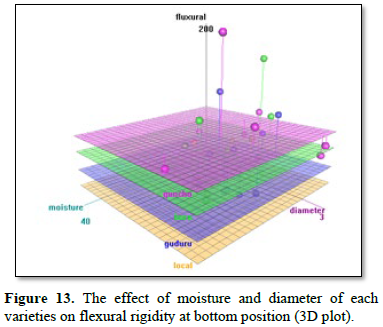 The effect of moisture and diameter at flexural rigidity at bottom position (segment) depicted in the Figure 13 and the increment of all factors increase the flexural rigidity, while in middle position the increment of diameter increase the flexural and increment of moisture decrease the flexural rigidity.