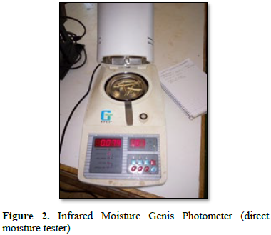 The moisture content of the stems was measured immediately after each test of each segment using the Infrared Moisture Genis Photometer (Figure 2) in (w.b.). To determine the mechanical properties of the tef stem within different moisture of the specimens, it was important to vary the amount of moisture in the stem. Though, the measured amount of water was sprayed using the syringe on the stem, which was packed with polyethylene material and it reserved for three days at controlled lab and refrigerator. During test the moisture differences were observed within the same stem at different positions, so the measurements of moisture were performed on the individual specimens. Before starting on each test, the required amounts of stems were allowed to warm up to the room temperature, in order to distribute equal moisture at the specimen (stem) as much as possible.