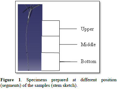 The variables were moisture content, diameter of the stem, variety and position of the stem (segments where the measurements performed). Because of the morphological shape, the diameter of the tef stem decreases from the bottom of the plant to the top (upper); therefore, stem shows different physical and mechanical properties at different heights due to the variable cross sectional area. Then, prior to test the samples stems (the panicles lengths were excluded) were divided at three equal sections (measuring position) at bottom, middle and upper (Figure 1). The segments’ length were 170-200 mm (because of the plant height difference), hence the segments lengths were different, but the test was performed at the center of each segments and avoided to measure near to the nodes (measurement at the node and near the nodes had better strength to the shear and elasticity properties). The local variety has short stem length and the samples were prepared with two segments.