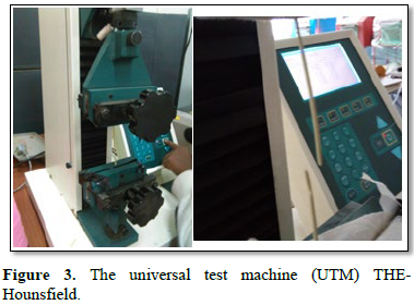 The tensile measurements were performed using Universal Testing Machine THE-Hounsfield England (Figure 3). The speed of the test was 75 mm/min. The specimen measured with constant length of segments and to avoid the skidding and squeezing of the stem, the stem ends were plastered (rolled) with the drawing scotch tape at each end and tightened on the upper and lower jaw of the instrument. The breakage of the specimens was not performed exactly at the center of the specimen it happened because of the rheological properties of the stem and the breakage acts at any position of the specimens, to avoid the jaws effect for this test, the breakage distance from the upper and the lower jaws decided to be from 30-40 mm, the specimens which had breakage lower than the specified gap were discarded. The test result data and graphs were recorded (Figure 4). The moisture of each specimen was measured immediately after performing each test/using the Infrared moisture Genis Photometer.