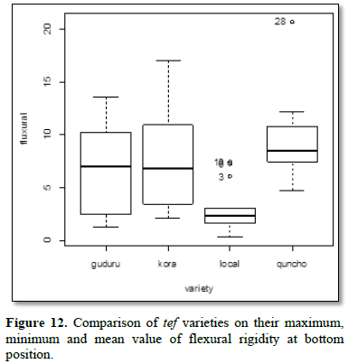 The lodging effect is highly related with the flexural rigidity of the tef’s stem. Flexural was calculated using the (Equation 4) and value of modulus elasticity (Equation 3). It is directly proportional to the modules of elasticity and moment of inertia. The value of flexural on a heterogeneous cross-section based on bending theory regarding an elastic behavior was reviewed, and also a calculation method of flexural rigidity for materials with heterogeneous cross-section was inspected. Based on the ANOVAs result variety has significant effect for the flexural rigidity. The value depicted in Table 4 and Figure 12. Since the flexural