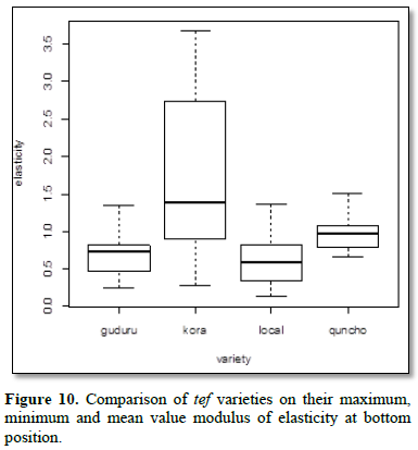 In the test, the number of nodes per segments was observed directly proportional for the elasticity properties, when the segment had 2 (two) nodes the modulus of elasticity was better than the segment which has one node, so the numbers of nodes on the stem are very important properties of tef for the strength and this property could help to generate lodging resistant variety. In all varieties the moisture variations depicted in inversely relation with the elasticity, on the increment of moisture above 25% the tensile force is decreasing, but most specimens tested below 25% and required greater tensile force, though it requires determining the optimum moisture content of the stem on which it gives the maximum value of the elasticity.