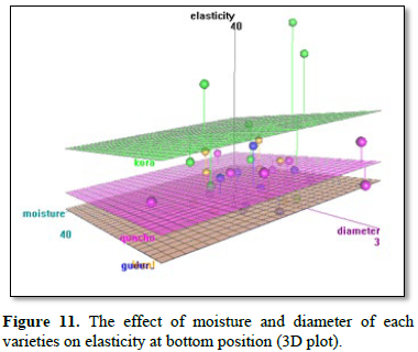 The graphical relation of the moisture and diameter of the stem at all segments were depicted on the 3D plot (Figure 11); and it shows diameter is the most dominant factor in modulus of elasticity of the stem in all varieties of tef.