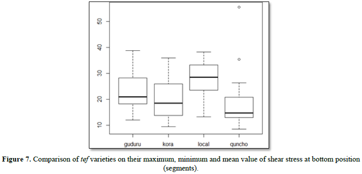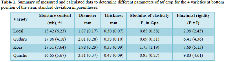Using the proper set up of the testing equipment and the empirical formulas for determination of the mechanical and physical properties four tef varieties of stem results (at bottom segment) are depicted in the Tables 1 and 2. The summary of results for modulus of elasticity and flexural rigidity of each variety are presented in the Table 1 and the summary results for the shear stress of each varieties are indicated in the Table 2.