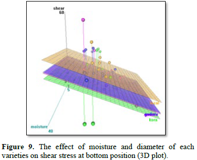 The ANOVAs result indicated the interactions of all factors on the shear stress at bottom position. Among the factors, the diameter and moisture content are highly significant for the shear stress under the 99% confidence interval, whereas the variety and thickness of the segments had significance for the shear stress under 95% confidence interval at bottom position of the stem. In regard of interaction, diameter with moisture is highly significant for the shear stress at the 99% confidence interval; the interaction between variety with diameter and between varieties with thickness had significance for the shear stress under 95% confidences. The 3D plot (Figure 9) shows the shear stress increase with increase moisture content and local variety has greatest values of shear stress than other three varieties.
