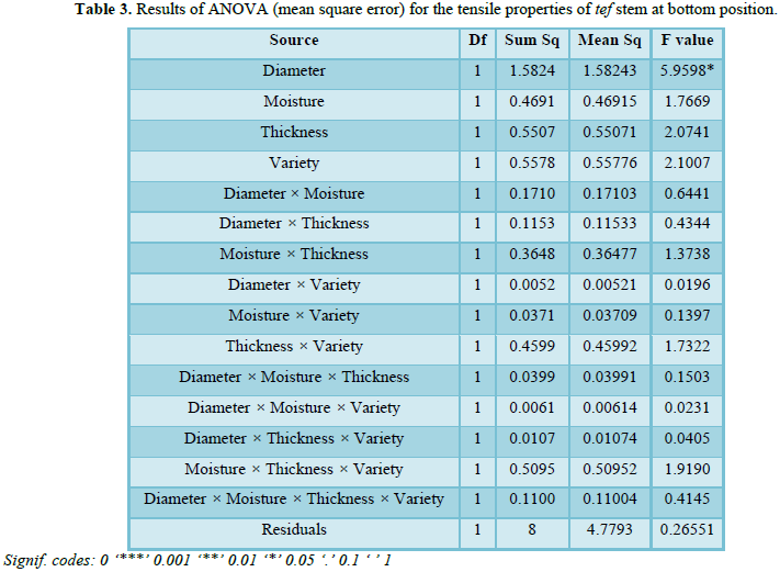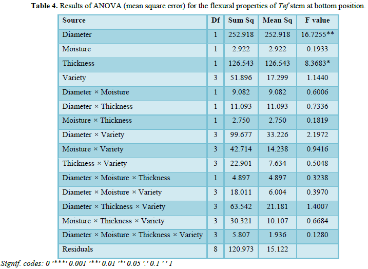 The ANOVAs’ Table 3 shows the interaction of all four factors at bottom segments of tef stems. The result indicated the independent variables diameter had significance impact for the modulus of elasticity fewer than 99% confidences at bottom position. Among the factors diameter and thickness and the interaction between variety with diameter and variety with thickness shows significance for the elasticity under 90% confidences at the middle position of the tef stem. The other factors interaction has no significance for the modulus of elasticity.