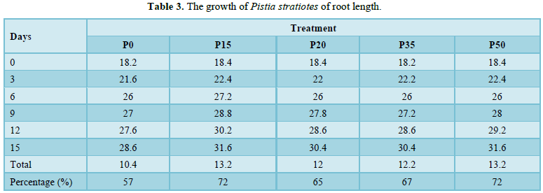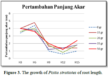 The treatment of inorganic compounds with a dose of 50 g has the longest root growth. This is caused by Pistia stratiotes water plants using N-nutrient elements in the test medium for root length growth. Walstad [20] explains that many N compounds in the waters will be able to accelerate the growth of roots but also can damage the plant because it can be toxic to the roots [21]. The Pistia stratiotes water plant utilizes the excess of N elements in test media for root growth (Table 3 and Figure 3).