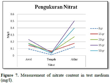 In this experiment was used Completely Randomized Design. Treatment is an inorganic compound with 5 levels (dose 0, 15, 20, 35, 50 g) and repeated 5 times. Observations are made every 3 days for 15 days. The observed responses were changes in root length (cm), leaf (mm), number of leaves (sheets/plants), new shoots (fruit), biomass (wet weight) and Pistia stratiotes ability to absorb nitrate and phosphate compounds in experimental media [11,12]. The experimental container uses a circular plastic jar. While the Pistia stratiotes test sample used was 7 g weight, which was cultured in water as much as 10 L/container and on the bottom of the container was given 200 g of soil substrate from the reservoir in public waters.