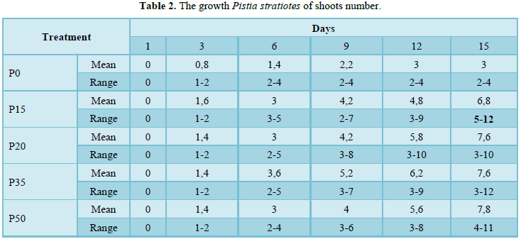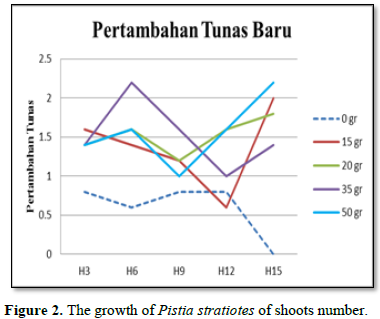The highest number of shoots was found in the 50 g treatment with a shoot-increase range of 4-11 fruit/plants. The treatment of inorganic compound 0 g is the least shoot growth (0-4 fruits/plant), and this new shoot comes from stolen. A stolen is more formed on test media containing nutrients. Bey et al. [10], more stolen is formed on the test water which contains many nutrients (inorganic material) in high concentration so that the number of tillers produced more and more. The formation of saplings in the Pistia stratiotes plant comes from stolen.