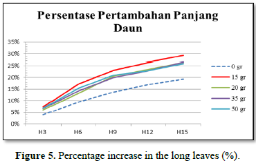 Leaf growth is more likely to grow in high concentrations of inorganic compounds so that the number of leaves produced is also more numerous, but the number of leaves decreases with increasing dose of inorganic compounds on the test media, there has been a change of inorganic compounds into glutamine [23]. In the test medium, the ammonium changes into glutamine that takes place rapidly in the leaves will accelerate the formation of new leaves. The impact will be the number of leaves that many in a relatively short time (Table 4 and Figure 4).