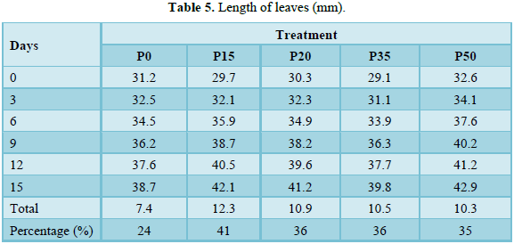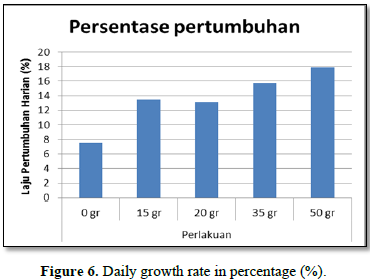 From this experiment, it is known that leaf length growth is faster in giving the dosage of inorganic compound 15 g, but the higher the inorganic compound is given it inhibits the growth of leaf length (20 g, 35 g and 50 g). Fertilizers or inorganic compounds are given can only accelerating the growth of shoots, root length and wet weight in the Pistia stratiotes water plant (Table 5 and Figure 5).
