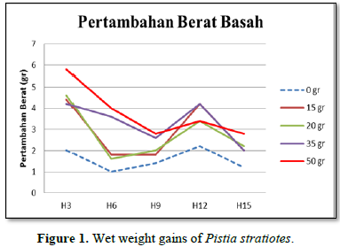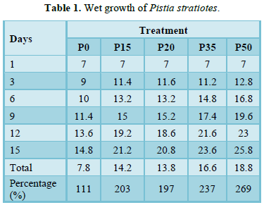 Biomass increase: From the experimental results, it is known that the highest growth of wet weight of Pistia stratiotes occurred at 50 g treatment with the average of 18.8 g wet weight increase. At the 0 g treatment is known to be very slow growth with an average of 7.8 cm. The height of this wet weight growth is due to absorption of N and P elements from the culture medium so that it affects growth and is very good for the growth of Pistia stratiotes. Idris [38], the increase of biomass in aquatic plants can occur due to the presence of luxury consumption which is marked by the decrease of nutrients in the waters. Excessive Luxury consumption is a common response to water plants in accumulating N and P elements higher than normal and used for growth, as a form of food reserves to support its growth activity (Table 1 and Figure 1) [13].