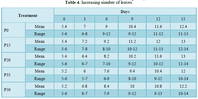 (T1); 20 (T2); 35 (T3); and 50 g/10 L (T4). Observation of growth and decrease