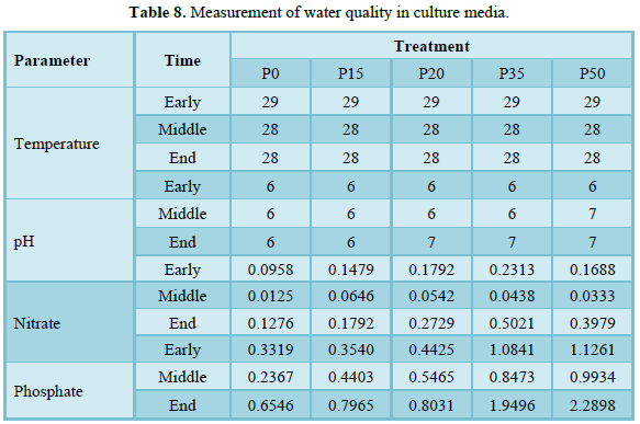 Data of measurement result of NO3, PO4, pH, temperature were analyzed descriptively. Daily growth rate calculator (LPH) Pistia stratiotes used the formula: