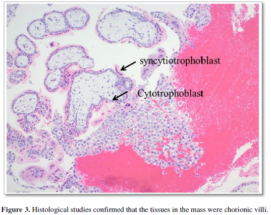 the mass were chorionic villi and that the final diagnosis was intraligamentous