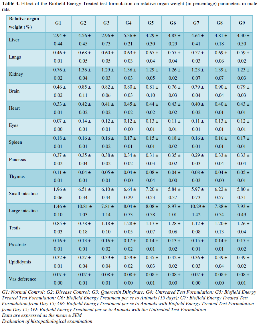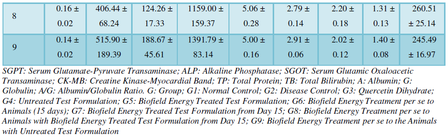 test formulation (15 days) and G9 group denoted as Biofield Energy Treatment per se to animals plus untreated test