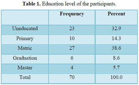 level of the participants is concern 23 (32.9%) were uneducated, 10 (14.3%) had