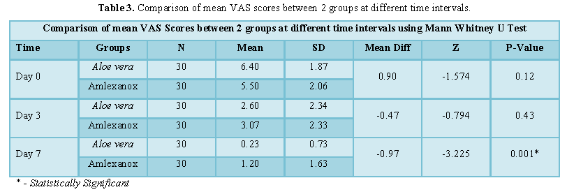 vera gel showed a significant difference in pain reduction in day 7 (P=0.001,