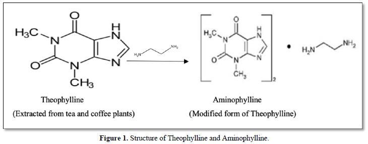 Aminophylline is a stable mixture or combination of Theophylline (1,3-Dimethylaxanthine) and ethylenediamine. The ethylenediamine confers greater solubility in water. Aminophylline is 20 times more soluble than theophylline alone and is used for the treatment of asthma and stable chronic obstructive pulmonary disease [10] (Figure 1).