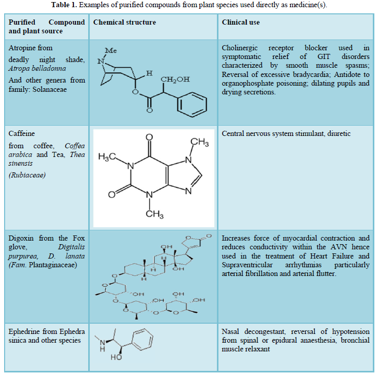 Rishton has observed that the limitations of artificial biochemical assays as applied to the screening of natural extracts must be realized in order to capitalize on the vast natural molecular diversity and rich ethnobotanic data that has emerged worldwide [7]. This mini review aimed at documenting conventional drugs that are derived from plants. Several purified compounds from plant species used directly as drugs have been documented, several compounds extracted from plant species are subsequently used in chemically modified forms as drugs while others serve as templates for synthetic analogues. These have been highlighted in the proceeding sections.