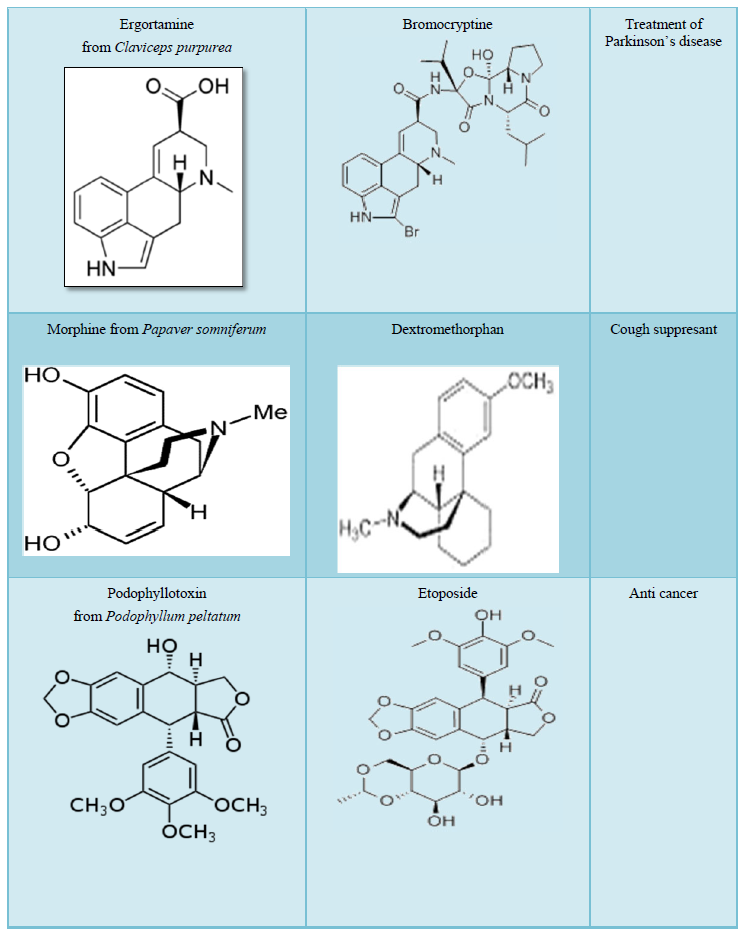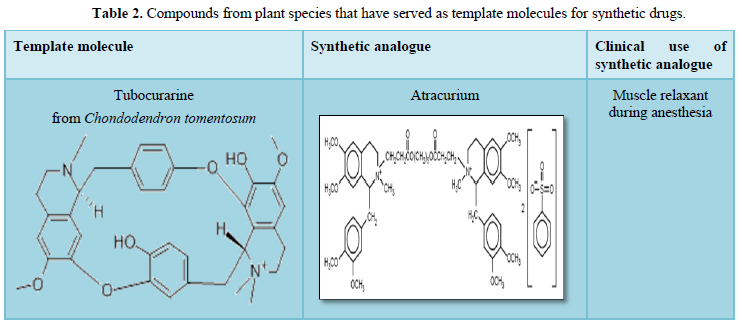 Some of the purely isolated compounds obtained from plants are used as template molecules for synthesis of conventional drugs [11]. This has been illustrated under (Table 2).