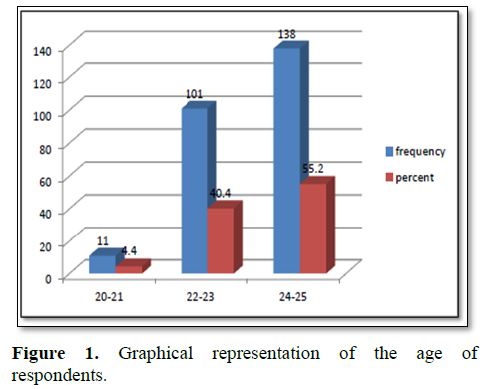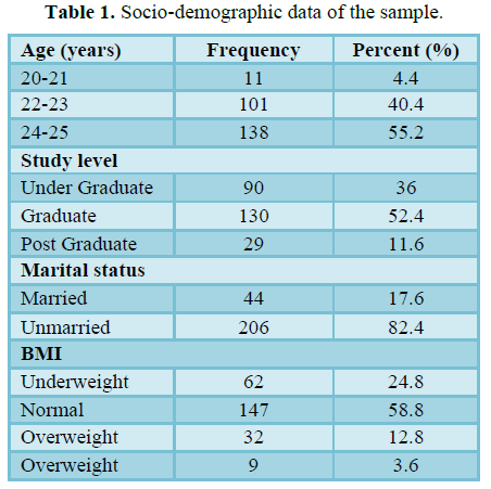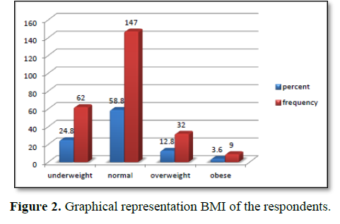 Table 1 represents socio-demographic characteristics of respondents. It shows that, the mean age of the participants was 23.48 years (SD 1.038) with range 20-25 years. Among 250 students, 36% were undergraduate, 52.4% were graduate and 11.6% were postgraduate. It was also observed that, 17.6% were married and 82.4% were unmarried. According to the BMI categorization, 24.8% of the respondents were underweight, 58.8% were normal, 12.8% were overweight and 3.6% were obese (Figures 1 and 2).