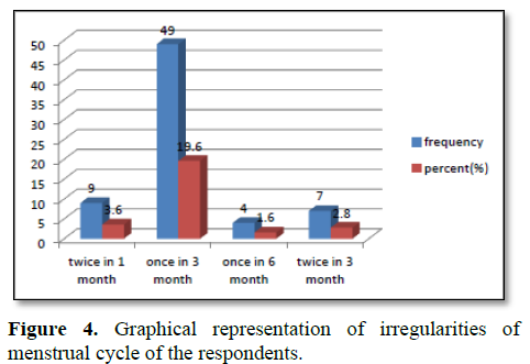 Figure 4 shows that, 3.6% respondents faced their menstrual cycle twice in one month. Once in three months were reported in 19.6% respondents, once in six months were in 1.6% and twice in three months were reported in 2.8% respondents out of the 69 respondents (27.6%).