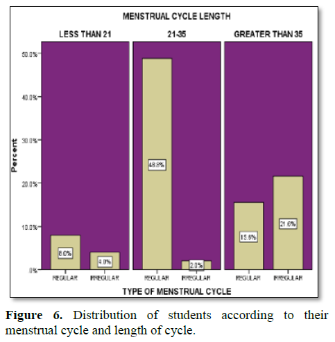 Figure 6 shows that 8% respondents whose menstrual cycle were regular and 4% respondents whose menstrual cycle were irregular and menstrual length of them were less than 21 days. Most of the respondents (48.8%) whose menstrual cycle were regular and only 2% of the respondents whose menstrual cycle were irregular and menstrual length of them were normal range (21-35 days). that 15.6% respondents whose menstrual cycle were regular and 21.6% respondents whose menstrual cycle were irregular and menstrual length of them were less than 21 days.