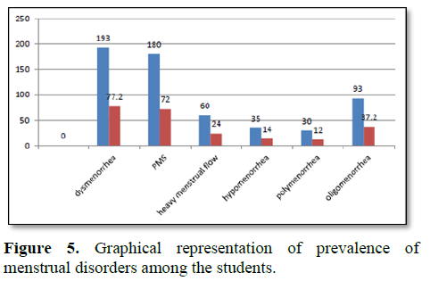 Figure 5 shows the menstrual disorders experienced by the study population. Dysmenorrhea reported in 193 (77.2%), premenstrual syndrome reported in 180 (72%), heavy menstrual flow reported in 60 (24%), hypomenorrhea reported in 15 (14%), polymenorrhea reported in 30 (12%) and oligomenorhea reported in (37.2%) of the respondents.