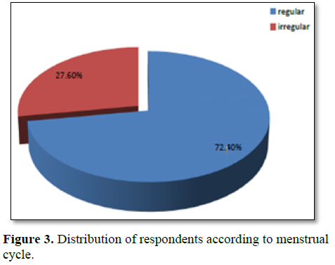 blood flow and 14% had scanty or little blood flow. The length of the menstrual cycle of the 127 respondents (50.8%) were 21-35, of the 93 respondents (37.2%) were greater than 35 and of the 30 respondents (12%) were less than 21. Most of them reported their menstruation duration range between 4-7 days (80.8%), 13.2% were greater than 7 and 6% were less than 3. 77.2% dysmenorrhea (painful menstruation) and 72% premenstrual syndrome were reported by the respondents. Figure 3 shows that 72.40% had regular menstrual cycle and 27.60% had irregular menstrual cycle.