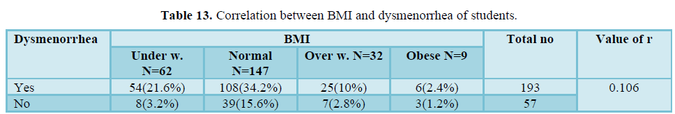 Table 13 shows that there was weak positive correlation of body mass index of students and dysmenorrhea (r = 0.106). There was very weak relation between BMI and dysmenorrhea