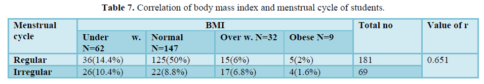 Table 7 shows that there was positive correlation between BMI of students and their menstrual cycle (r = 0.651). 10.4% respondents were underweight, 8.8% respondents whose BMI were normal, 6.8% respondents were overweight, 1.6% respondents were obese and their menstrual cycle were irregular. 14.4% respondents are underweight. 50% respondents were normal, 6% were overweight, 2%