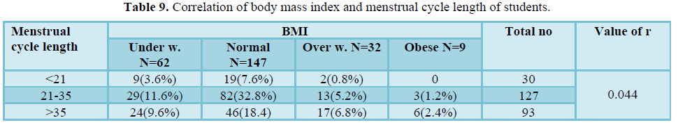 Table 9 shows that there was very weak positive Correlation of body mass index and menstrual cycle length of students (r = 0.044). Most of the respondents (32.8%) whose BMI were normal and they faced their menstrual cycle 21-35. 3.6%, 7.6% and 0.8% were underweight, normal and overweight respectively and they had polymenorrhea. 9.6%, 18.4%, 6.8% and 2.4% were underweight, normal, overweight and obese respectively and they had oligomenorrhea.