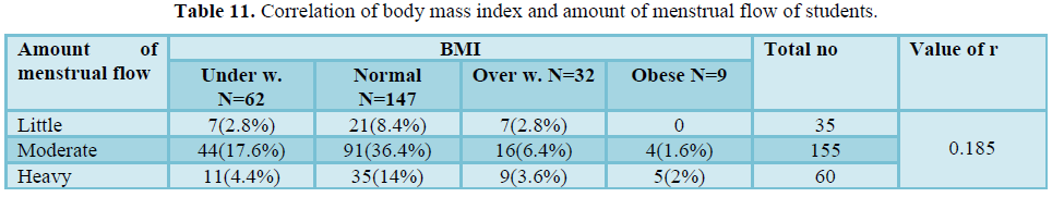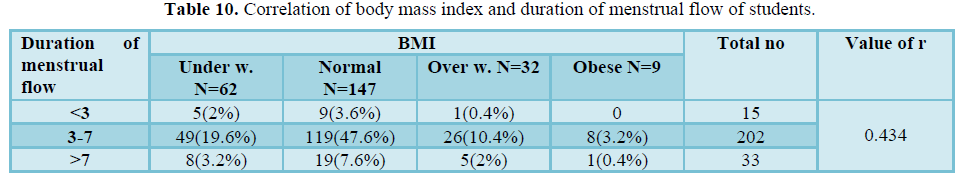 Table 10 shows that there was positive correlation of body mass index and duration of menstrual flow of students (r = 0.434). 2%, 3.6% and 0 .4% respondents were underweight, normal, overweight and respectively and they had hypomenorrhea. 19.6%, 47,6%, 10.4% and 3.2% respondents were underweight, normal, overweight and respectively and they have normal duration of menstrual flow. 3.2%, 7.6%, 2% and 0.4% respondents were underweight, normal, overweight and respectively and the duration of menstrual flow of them were greater than 7.