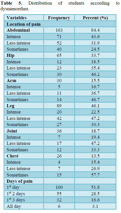 Table 5 represents dysmenorrhea of the students. Out of the 193 participants, most of the students were suffered from abdominal pain (84.4%). 33.7% hip pain, 15.5% arm pain, 46.1% leg pain, 18.7% join pain and chest pain 13.5% of the respondent were reported. One respondent was suffered from different pain and various intensity. Abdominal in pain were most intense among the students. The pain was lasting in various range 51.8% of the student’s 1st day, 28.5% 1st 2 days, 16.6% 1st 3 days and 3.1% all day suffered from pain (Figure 9).