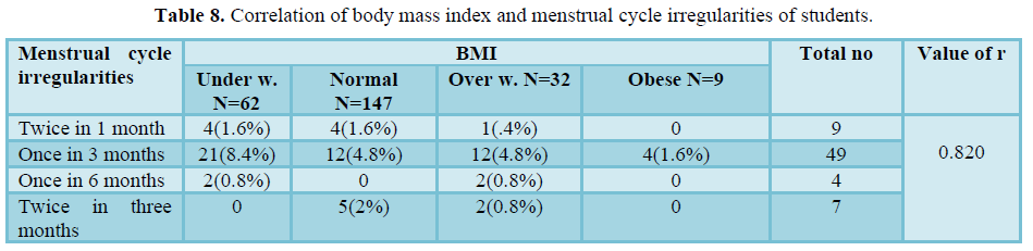 Table 8 shows that there was strong positive correlation of body mass index and menstrual cycle irregularities of students (r = 0.820). 1.6% respondents were underweight and normal BMI, 0.4% respondents were overweight and they faced their menstrual cycle twice in one month. Most of the respondents (8.4%) were underweight and they faced their menstrual cycle once in three months. 2% respondents were normal and they faced their menstrual cycle twice in three months.