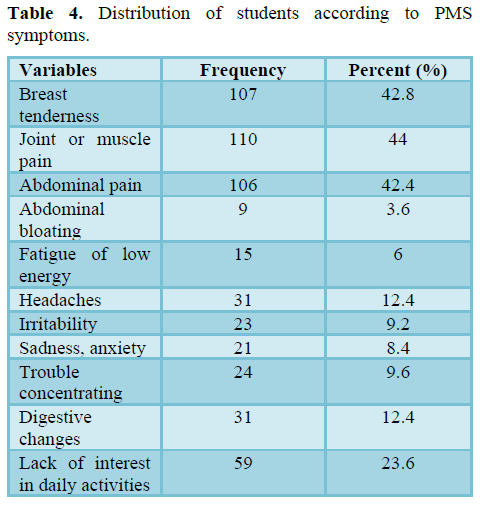 Table 4 represents PMS symptoms of the respondents. Out of the 180 students most of the students were experienced by joint or muscle pain (44%), breast tenderness (42.8) and abdominal bloating (42%). More than one symptom was reported in one respondent before the menstruation (Figure 8).