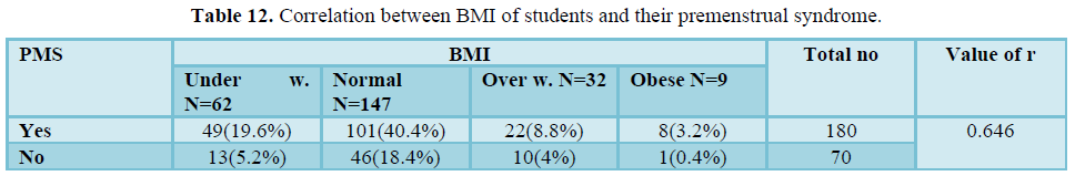 Table 12 shows that there was positive correlation of body mass index of students and their premenstrual syndrome (r = 0.646).