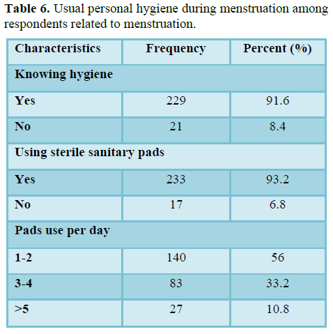 Table 6 shows that, out of 250 students, most of the student known about hygiene and 8.4% of the students don’t know about hygiene. 6.8% of the students did not use sterile sanitary pad during menstruation. Most of the students used 1-2 pads per day (56%), 33.2% used 3-4 pads and 10.8% used more than 5 pads per day.