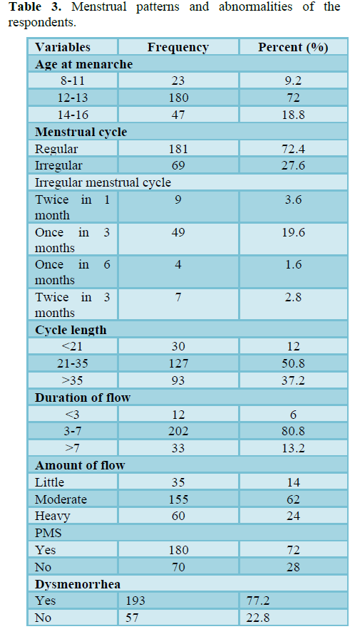 A total 250 students completed the questionnaire. The age, BMI, qualification of study, marital status, menarche age, menstrual cycle, cycle length, duration of menstruation, menstrual flow, PMS, painful menstruation, treatment for menstruation abnormalities, any other major diseases, exercise, meal and hygiene management of individual were recorded.