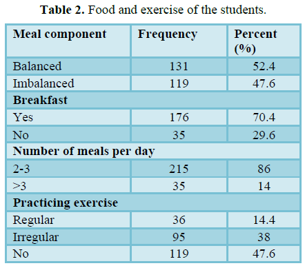 Table 2 represents some life style habits of the students. Out of the 250 respondents, the meals components (52.4%) respondents were balanced and 47.6% respondents were balanced. 70.4% respondents had breakfast and 29.6% are not. 86% student have meal 2- 3 times per day and 14% have >3 times per day. It was also observed that 14.4% student practicing exercise regularly, 38% students were irregular and most of the students (47.6%) were not.