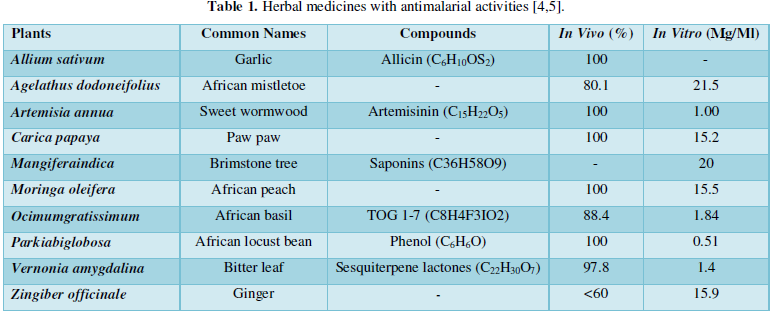 Herbal medicines have been used to treat malaria for thousands of years in various parts of the world especially Africa as a result of parasite resistance, mosquito vector resistance, non-availability of vaccine and adverse reactions of antimalarial drugs. Thus, malaria is currently a public health problem. In this review, we discuss the in vivo and in vitro antimalarial activities of herbal medicines.